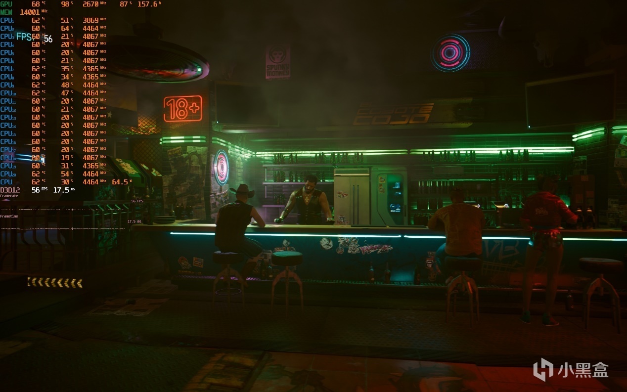 ▼酒吧吧檯遊戲幀數在56幀左右,遊戲畫面的光影效果很真實。