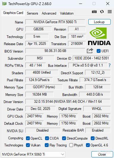 ▼簡單跑個這張RTX 5060 Ti的硬件參數,核心是GB206,流處理器4608個,顯存是海力士出品的GDDR7顆粒,位寬128bit。