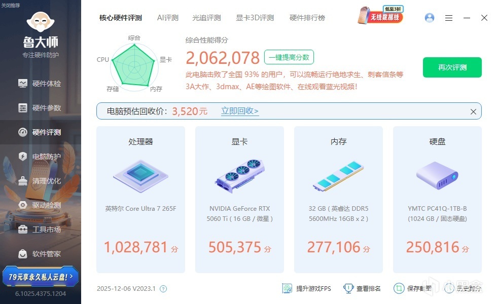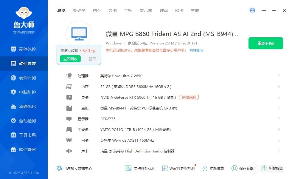 ▼整機配置一覽,處理器是265F,內存是英睿達的DDR5 16GB*2 5600MHz,顯卡是RTX 5060 Ti 16GB。