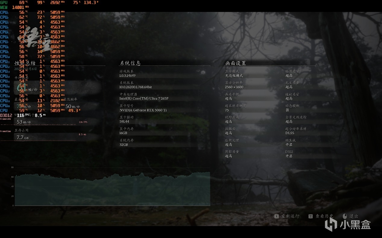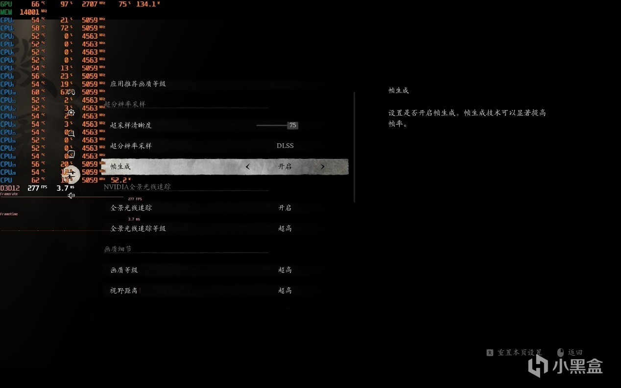 ▼黒神話悟空,2K分辨率,畫質超高,光追超高,超採75。