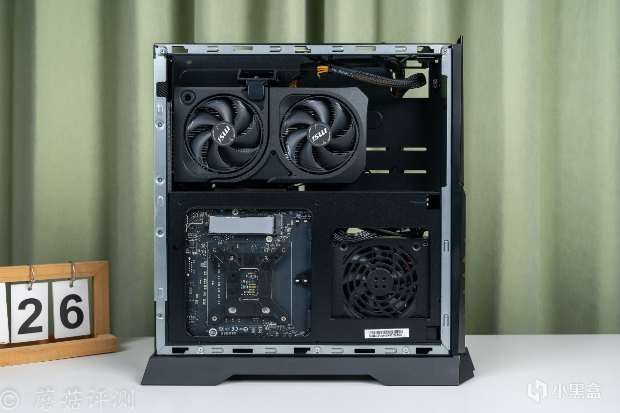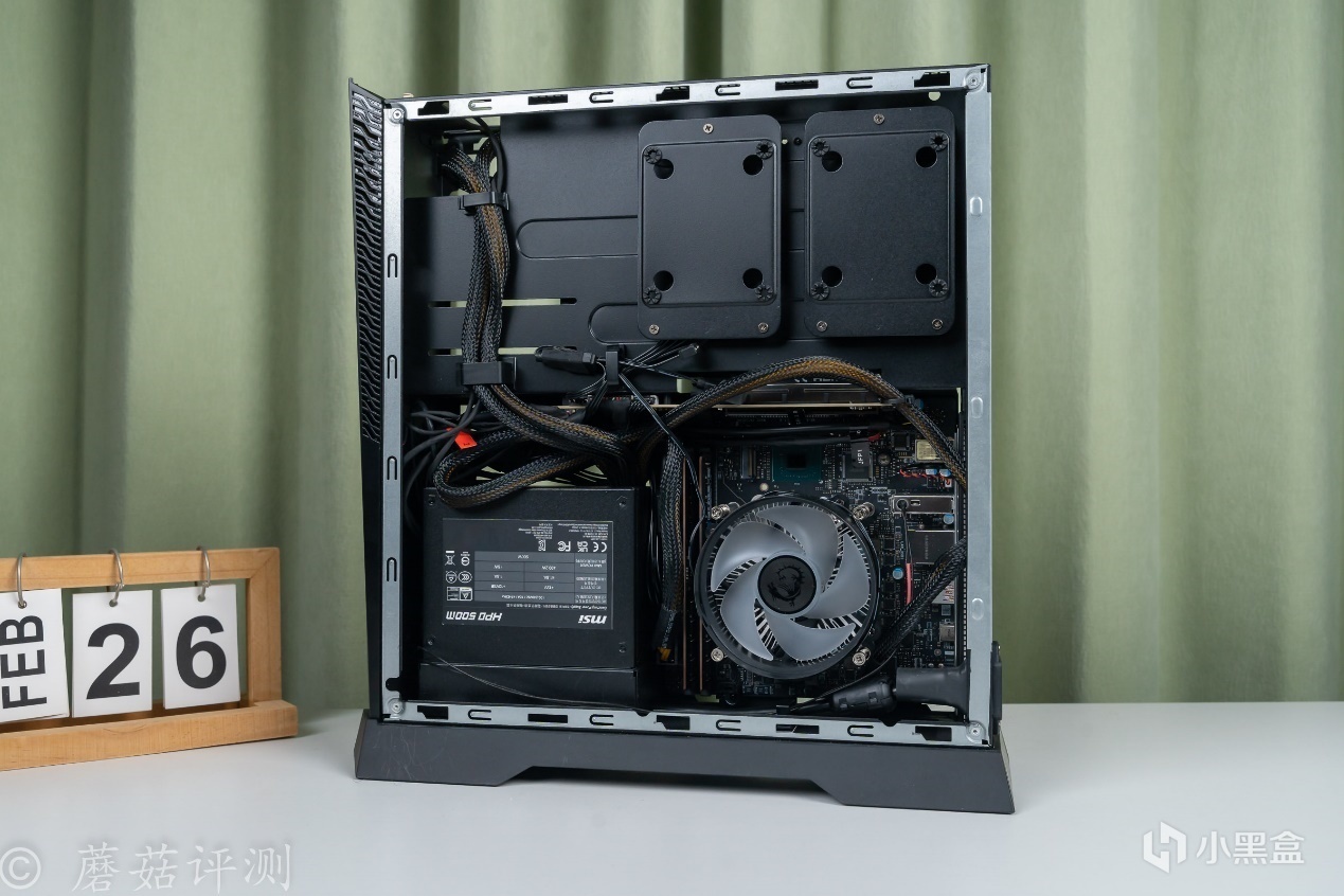 ▼取下機箱兩側的側板,機箱內部的結構、細節會看的更加清楚。右側下半部分是主板安裝位,左側下半部分是電源安裝位,上面還有兩個硬盤托架,支持兩塊2.5英寸硬盤的安裝固定。