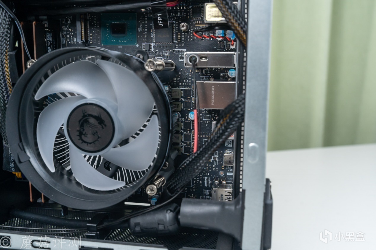 ▼靠近看看,內部是一個下壓式的散熱器,散熱風扇的扇葉是乳白色的,支持ARGB燈效,支持主板同步。