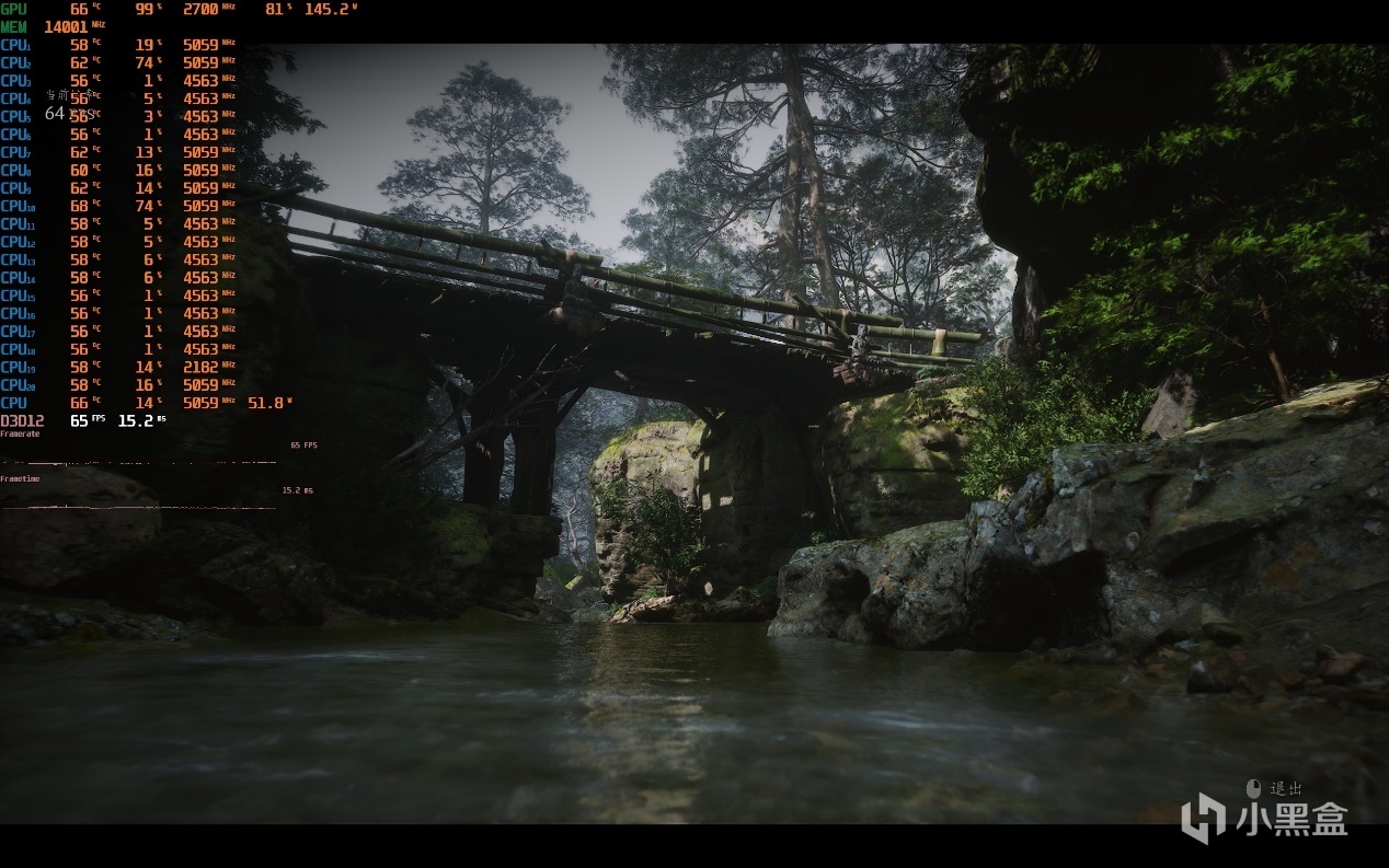 ▼小橋處的遊戲幀數在65幀左右,水面的波光效果不錯。