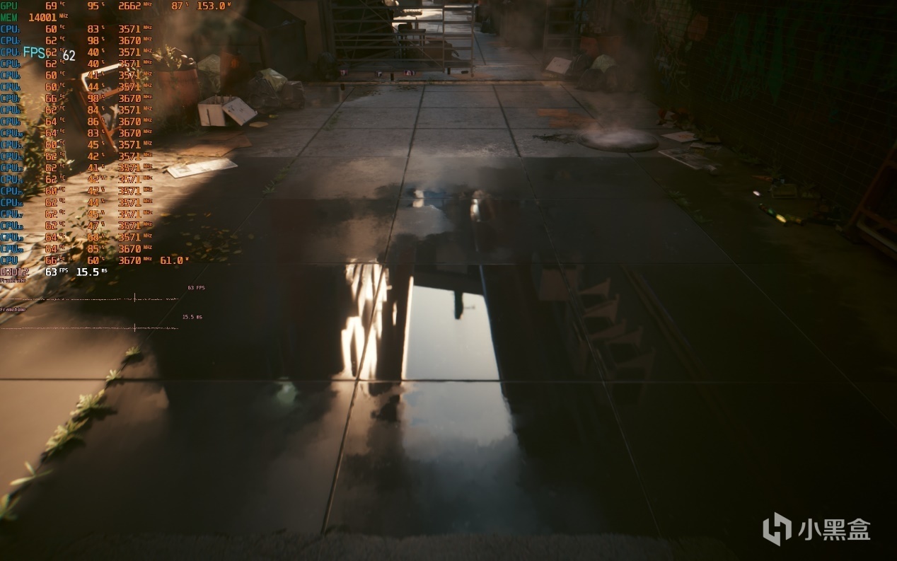 ▼室外水灘中的倒影很真實,光追效果真不錯,遊戲幀數在63幀左右,超過了60幀及格線。