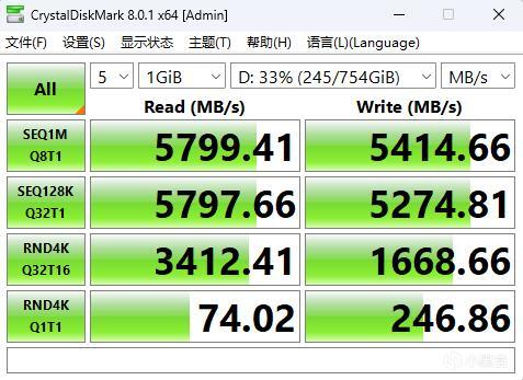 ▼簡單跑個DiskMark測試,順序讀取速度5799MB/s、寫入速度5414MB/s,4K讀取速度74MB/s、寫入速度246MB/s,表現不錯。