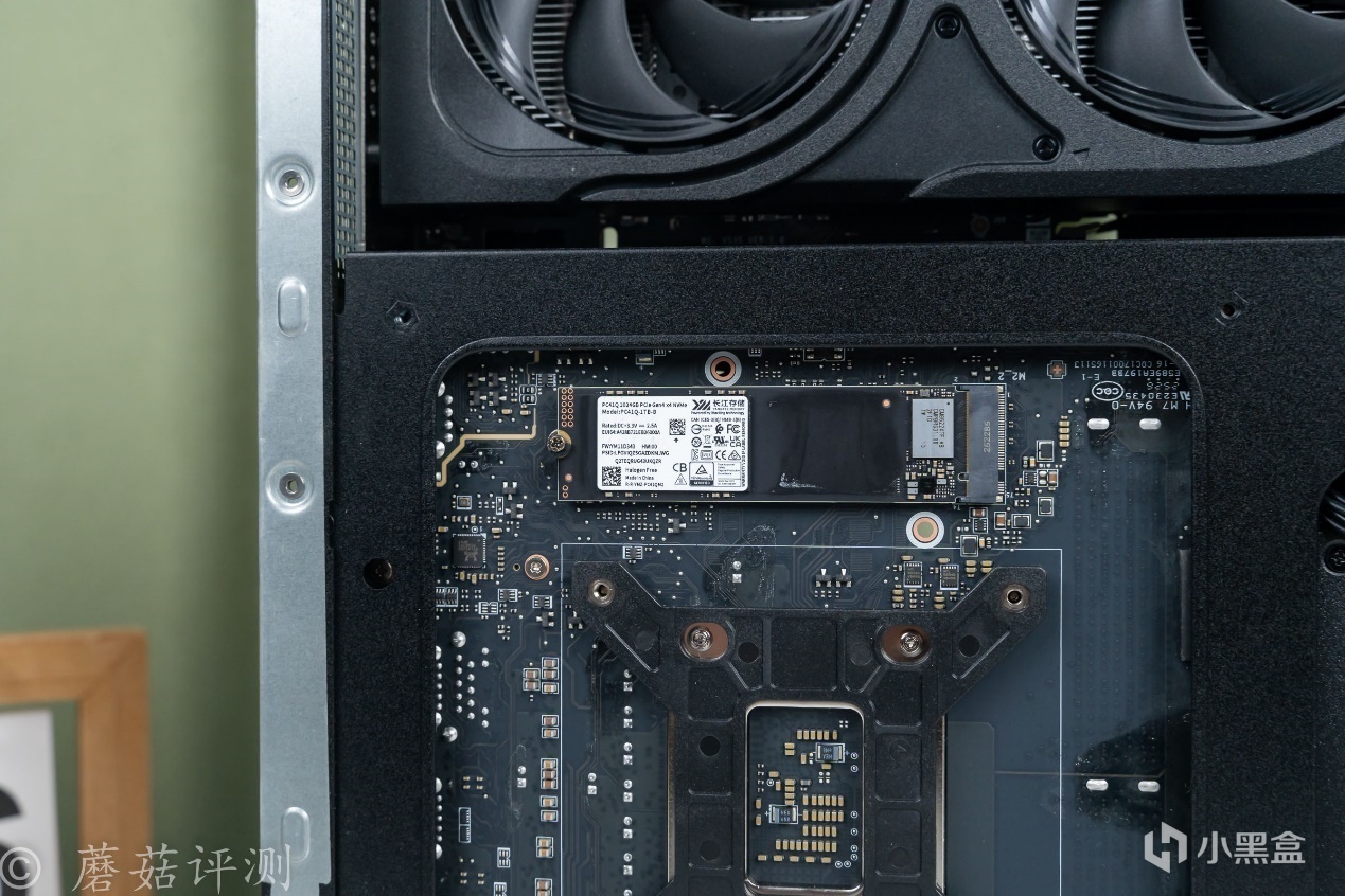 ▼在主板的背面,還有一個M2插槽,並標配超厚的導熱墊,把固態硬盤的溫度傳遞給主機側板,輔助散熱。標配固態是長江存儲的PCIe 4.0固態硬盤PC41Q,容量1TB。