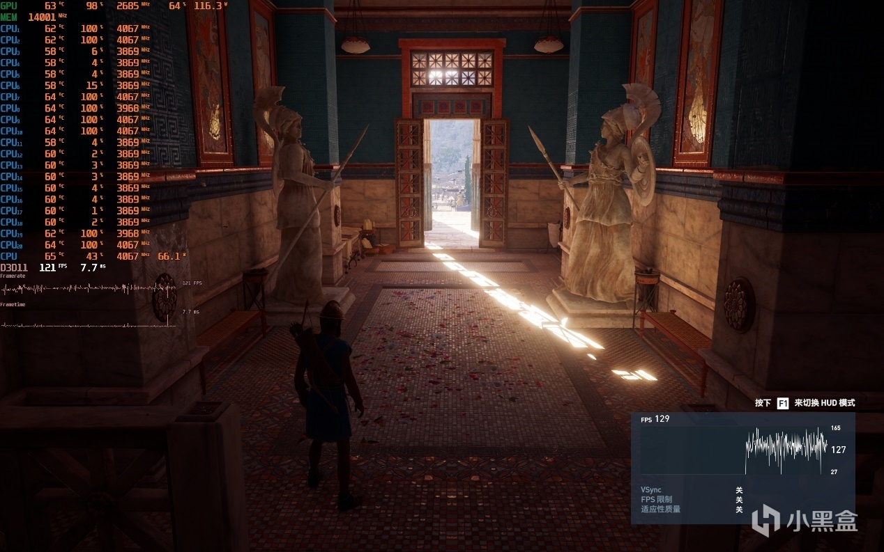 ▼衆生平等奧德賽,2K分辨率,極高畫質,體積雲最低,走廊遊戲幀數在121幀左右。