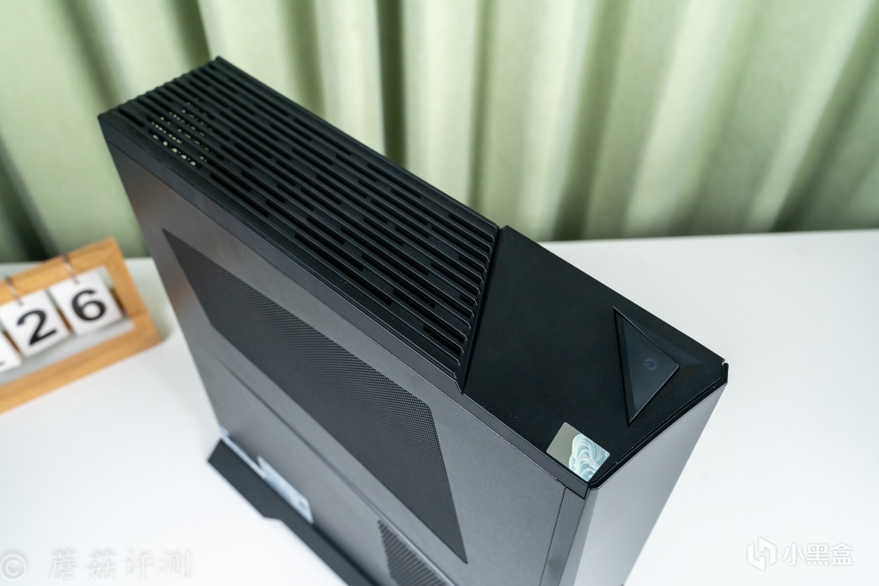 ▼機箱頂部,也有長條的格柵設計,用於顯卡部分散熱。靠前側的部分,是主機的開機鍵,面積很大,三角造型。