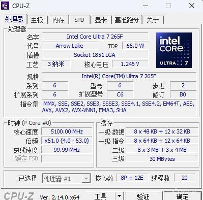 ▼簡單看下這顆酷睿 Ultra 7 265F處理器的參數,P核8個、E核12個、共20線程,三級緩存30MB,表現不錯。
