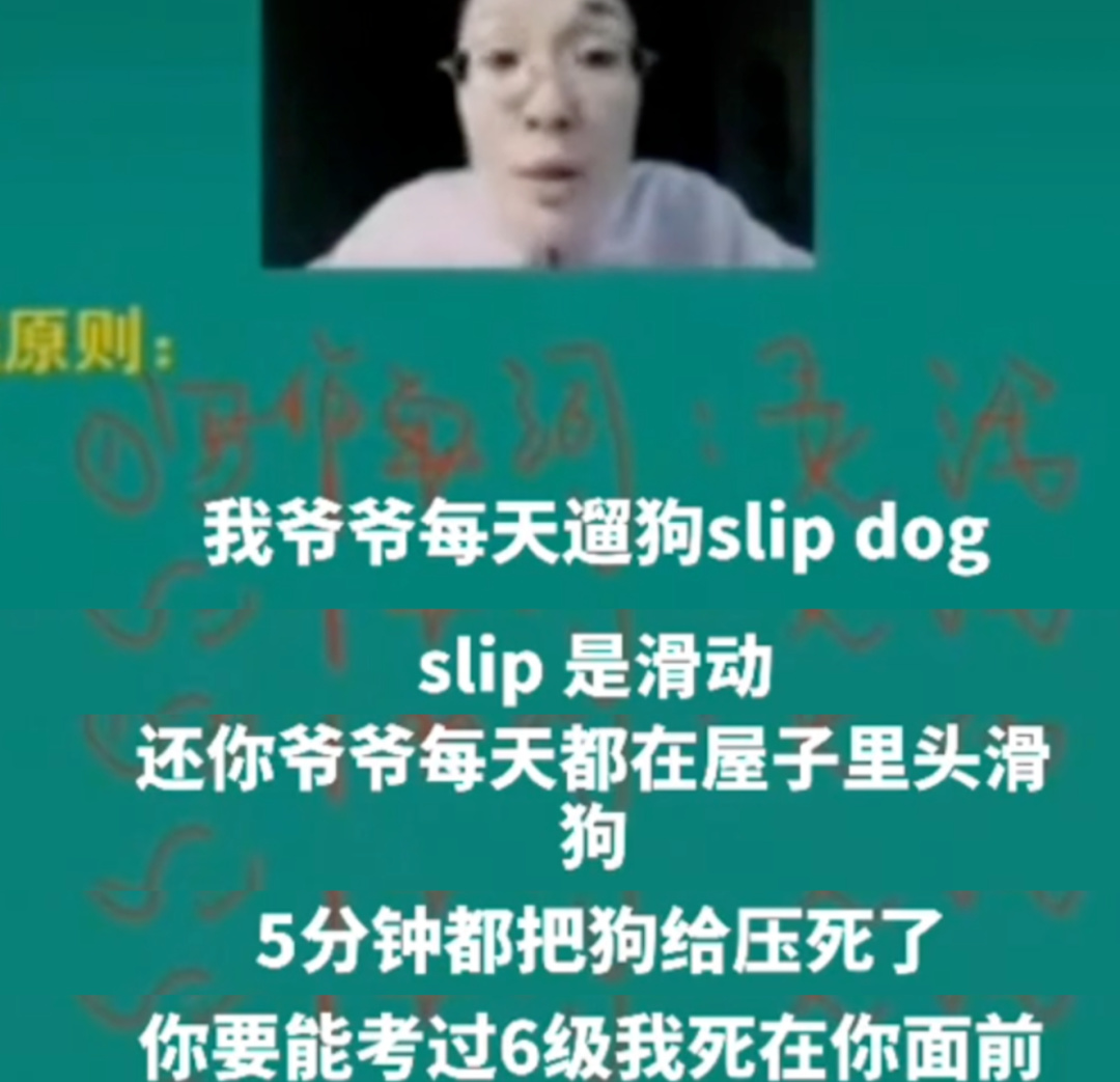 把 爷爷遛狗 译成 slip dog ,吐槽 谁家爷爷天天坐狗身上滑 。