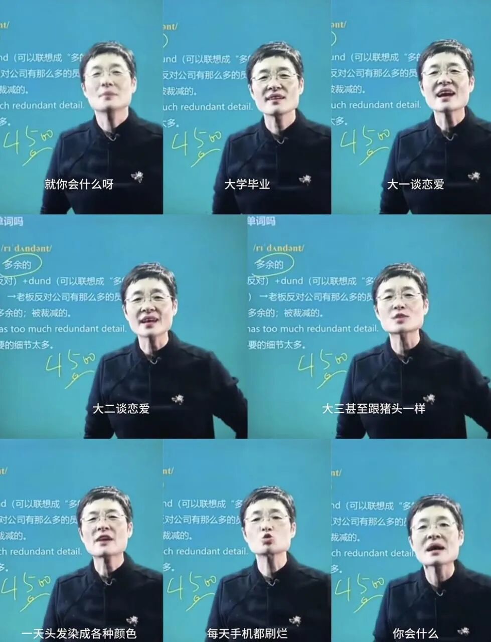视频里的她戴着眼镜,短发利落,对着镜头叉腰瞪眼,语气严厉又滑稽:“大一谈恋爱,大二谈恋爱,大三跟个猪头一样,手机都刷烂!”“20来岁还在骗自己假装学习,你恶不恶心!”那些看似刻薄的吐槽,精准得像在学生身上装了摄像头——喝奶茶的、抠指甲的、听课走神的,全被她隔空 抓包 。