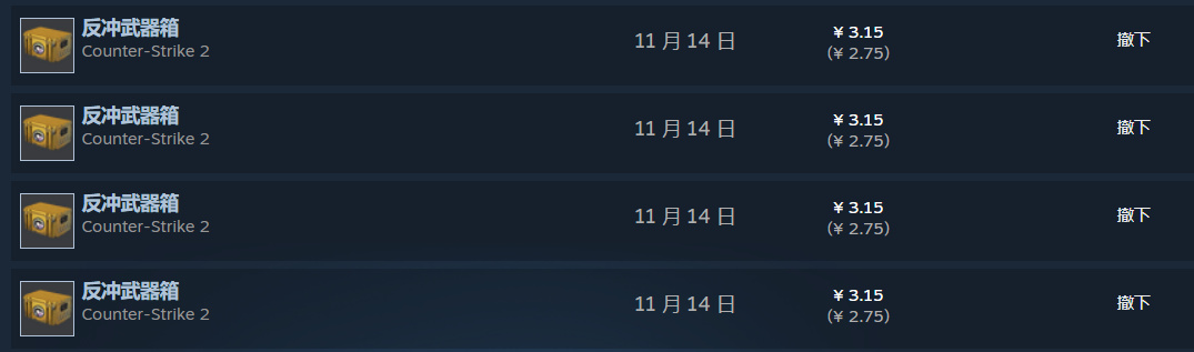 有时候运气不好,买的时候在价格高位,7天冷却期之后才能上架,但此时价格已经跌了很多,完全达不到自己预期的价位,箱子就只能一直挂在市场上出不掉,我还不好“割肉”——若是低价“割肉”的话,那我折腾半天箱子图个啥呢?这时候的这感觉简直和“套牢”没区别,我就是这种类型的“受害者”之一。