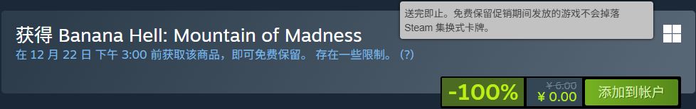 原价6元的Banana Hell: Mountain of Madness,于北京时间12.22,15:00截止免费领取!