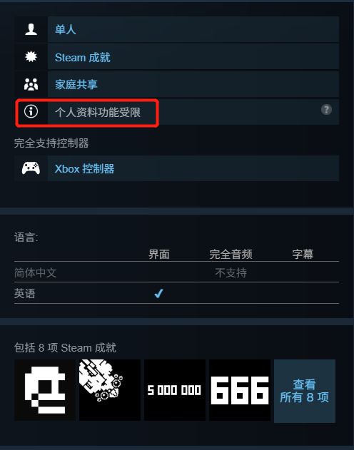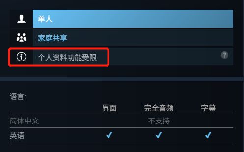 本游戏不支持中文,并且还个人资料受限(不计入账号游戏数据统计,并无资格在steam个人资料的某些游戏展柜展示)。介意的uu们请谨慎领取
