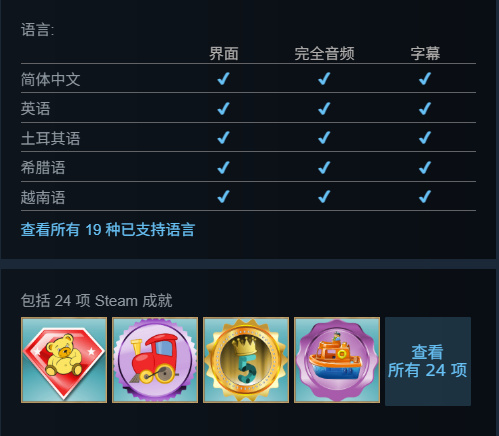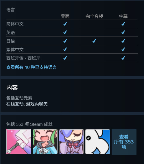 游戏包括353项Steam成就,支持简体中文界面和字幕