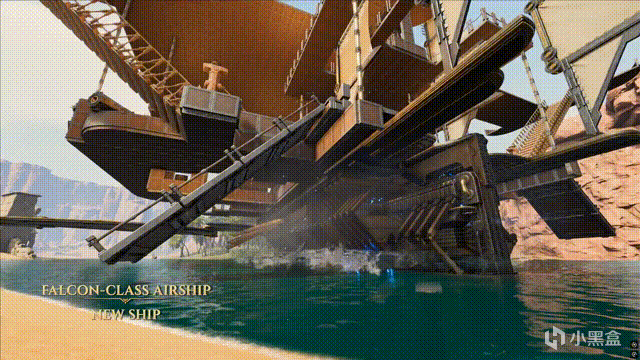 新船只 - 隼级飞行船。真的大!我跟 Asmongold 一样被震惊到了。看起来应该是参考了古埃及文化中象征太阳神穿越冥界的太阳船,在游戏中被创新地设计为可自由建造与改装的反重力飞船,打破了人们对船能在水上航行的刻板印象。