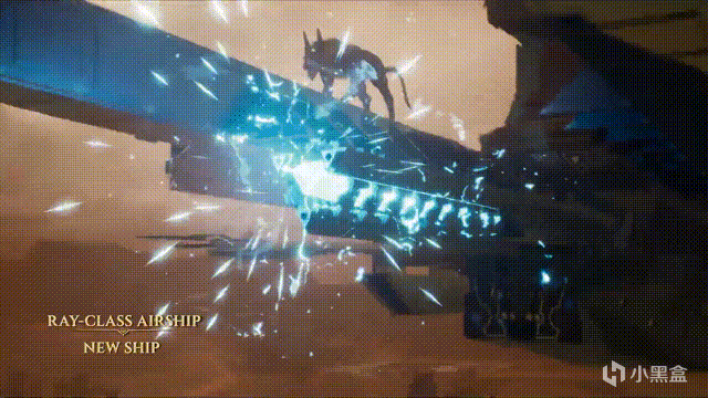 新船只 - 鳐级飞行船。真的更大!这艘船简直是天空中的航母,可装载弩炮与舰载加农炮等功能模块,成为空中武装堡垒。你看这个 BOSS 被直接一炮带走,其威慑力可见一斑!