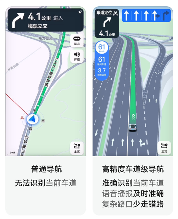 高精度定位服务基于实时动态差分技术,提供更高精度的GNSS定位,通过误差模型计算,使得定位能力提高,误差在1米左右,可帮助地图应用识别到行驶中的具体车道,及时准确地进行语音播报。