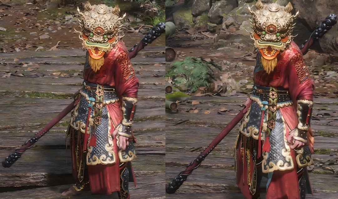 我们直接对比在同一画面模式下初版PlayStation 5和PlayStation 5 PRO的画面表现。以光线充足的室外场景为例,可以看到同样是在开启了“性能优先”模式后,PlayStation 5 Pro版的材质纹理明显会更清晰一些,而在装备了像彩金狮子头这样带有强金属光泽的披挂后,也能明显看出PlayStation 5 Pro对光影细节的处理更真实,不会像初版那样糊成一团,压根没法细看。