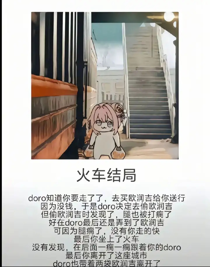 她是一个可爱搞怪、活泼开朗的朋友、是一个给你买哦润吉的苦情角色,也是一个笨手笨脚还带点蠢萌的小家伙。但无论如何,她都绝对忠诚于你——“Doro什么也不知道,但Doro只是想给你一些你喜欢的哦润吉吃”。即便,最后可能是一些万恶的发刀人,所编撰出来的坏结局。