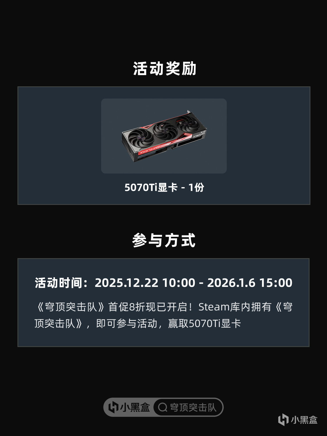 首促8折,即刻入手!Steam庫內擁有《穹頂突擊隊》(https://api.xiaoheihe.cn/store/roll_room_v2?award_id=5409),即可參與活動,贏取5070Ti顯卡