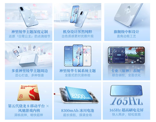 核心配置上,神里绫华定制机配备6.83英寸1.5K高刷屏,搭载高通第五代骁龙8芯片,内置8300mAh电池,支持100W有线快充。