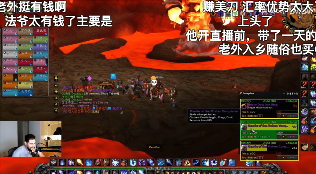 那天凌晨3点(北京时间),Ziqo为跟团里另一个法师竞价极品装备,直接杀红了眼。正好他之前带人升级挣了不少金币,这下真是“挣美元/欧元在中国花”了。