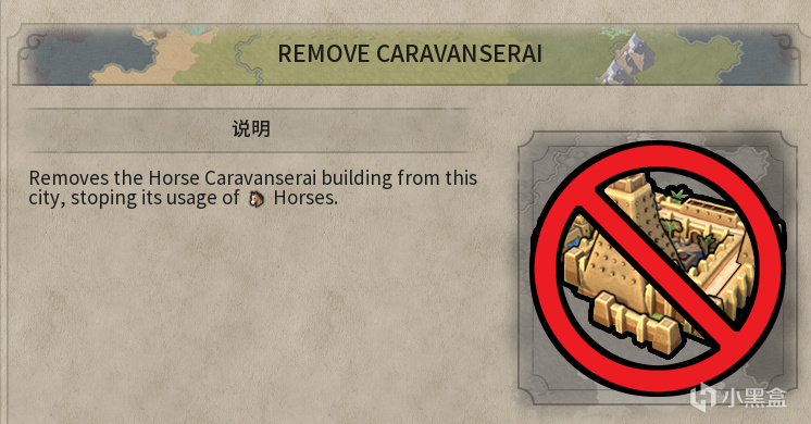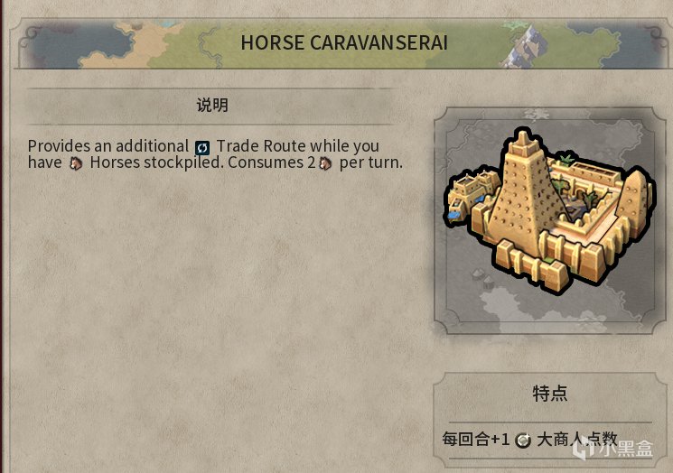 该模组在解锁货币科技后,将马帮客栈建筑添加到商业中心。该建筑需要市场建筑作为前提,能使贸易路线容量+1,但每回合消耗2匹马。若玩家没有马匹储备,则额外贸易容量将失效。同时新增一个城市项目,允许拆除该建筑以停止其马匹消耗。