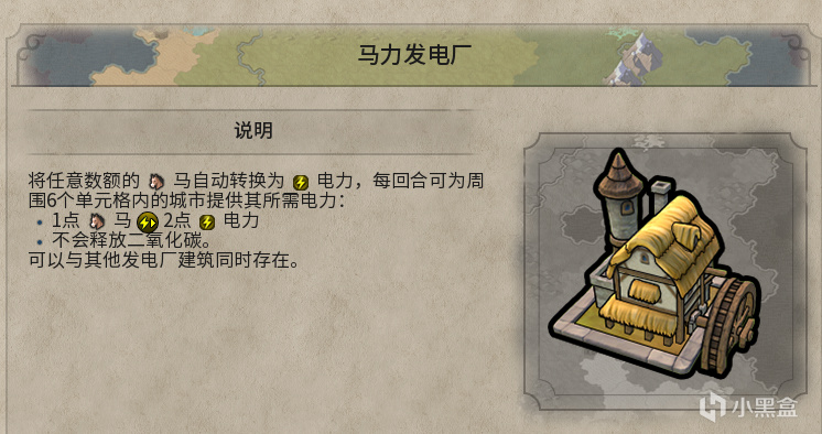 该模组为游戏加入一个新的发电厂建筑——”马力发电厂“,通过电力科技解锁,其根据工业区的生产力相邻加成,提供等同的食物,并将任意数额的 马自动转换为 电力,每回合可为周围6个单元格内的城市提供其所需电力:1点马提供2点电力。