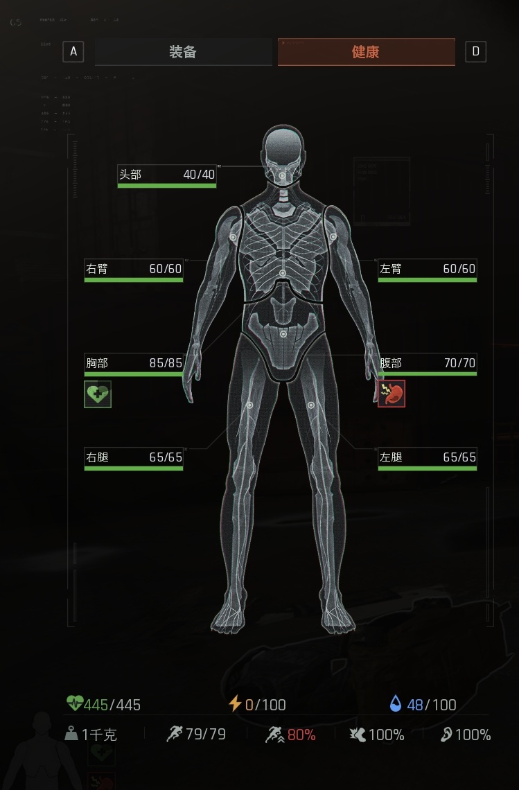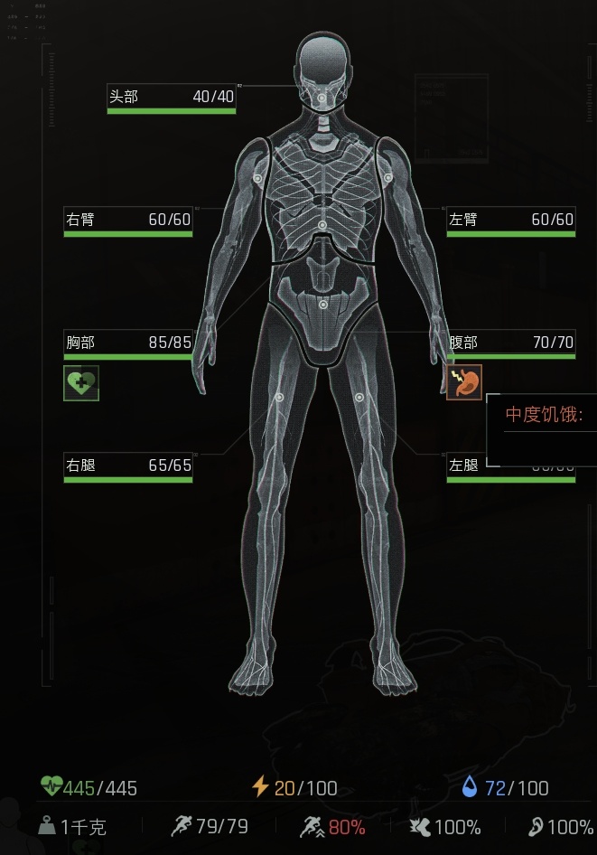 腹部损伤: 提高能量与水分消耗速度,每30秒损失3能量+3水分。每分钟额外消耗3水分