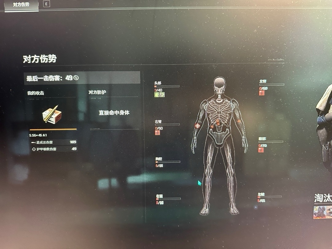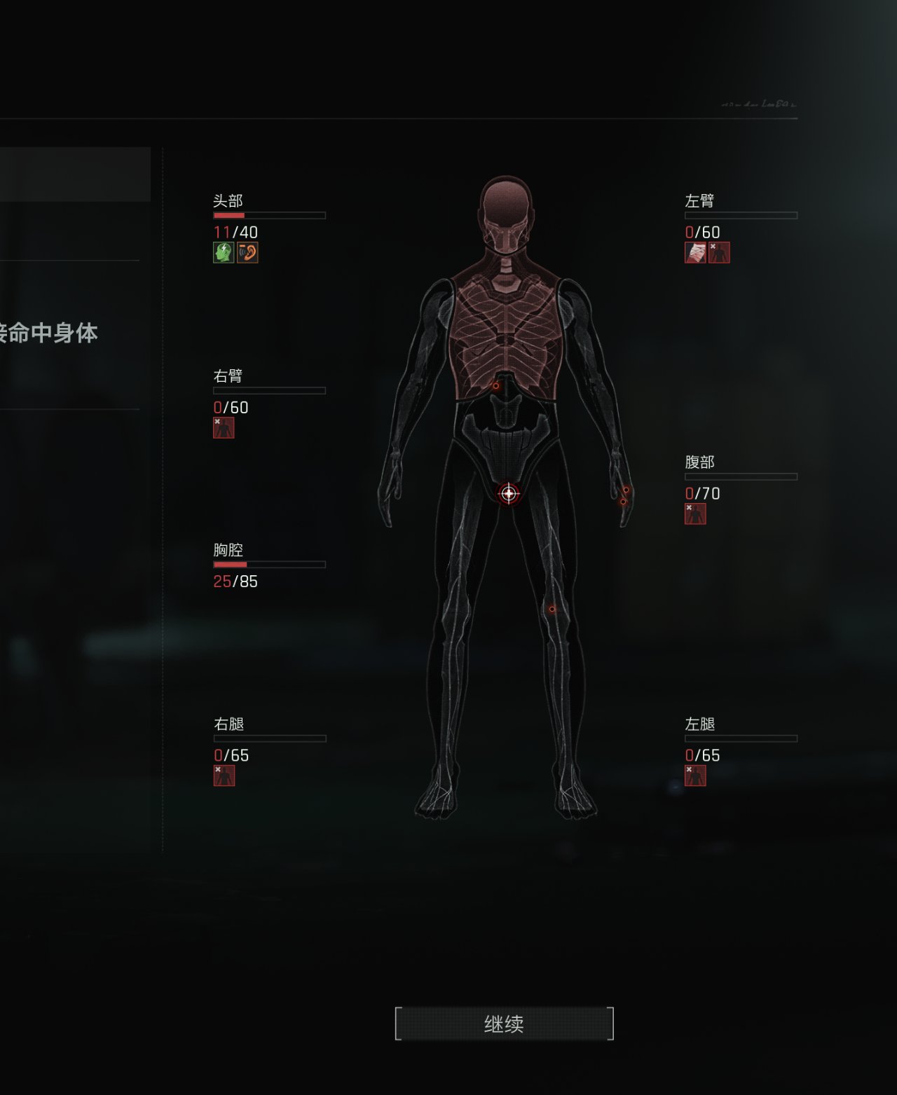 在这7个部位中,头部与胸部为致命部位。若受到直接伤害时(即被子弹 近战 爆炸物等直接命中),头部血量清0则判定死亡,胸部血量清零判定倒地。若在此基础上判定不存在救援条件(例如没有队友或没有自救包),则直接死亡