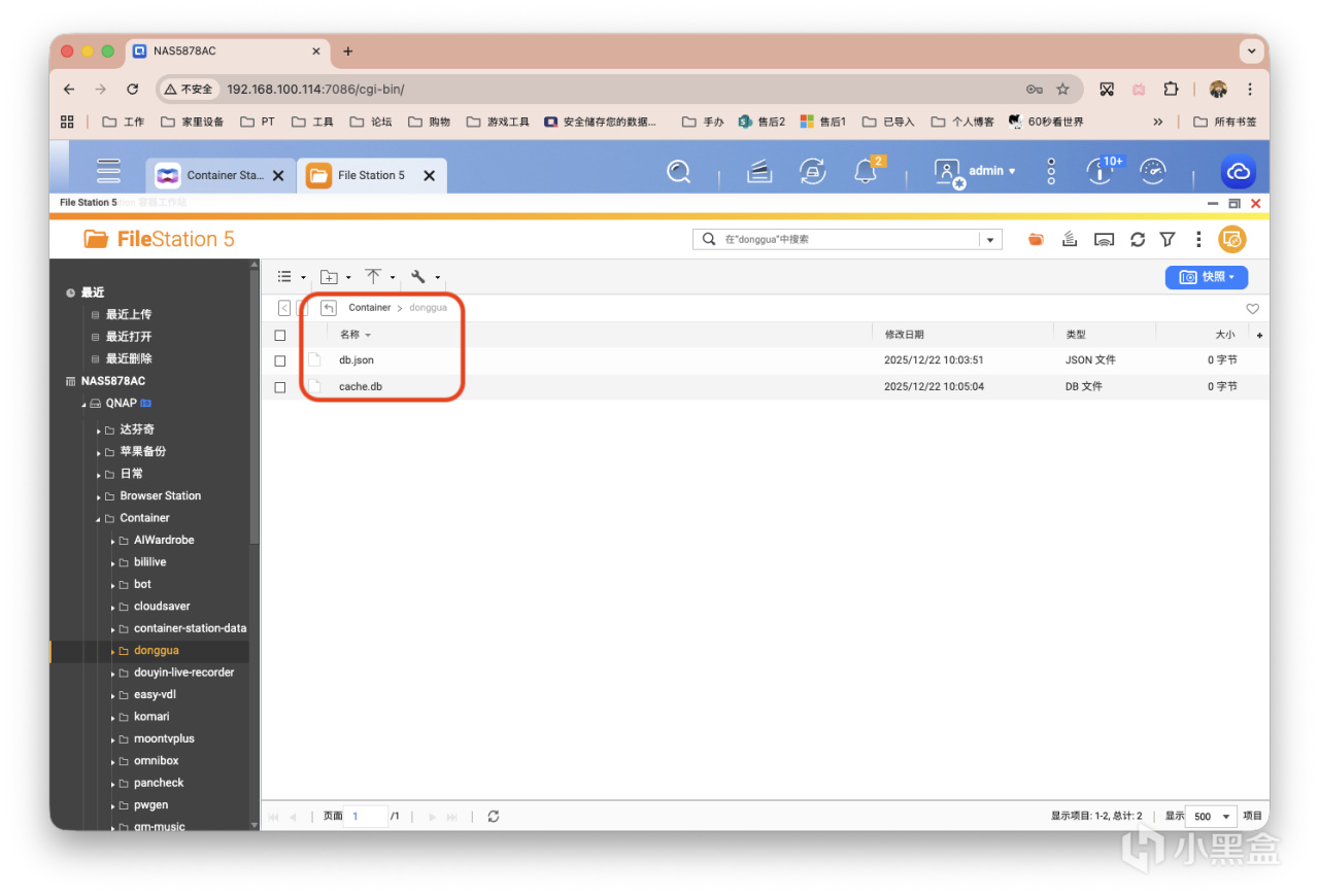 接着打开NAS,准备好部署文件目录。威联通的Docker路径一般为/share/Container/donggua,大家可以自行更改。然后创建两个文件放在该目录下。分别为db.json和cache.db,如下图。