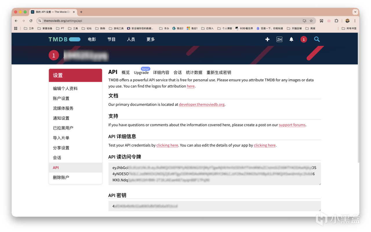 首先咱们需要搞个TMDB API。注册账户之后,去账户设置中开启一个。如下图最底下的「API 密钥」,复制好了备用。