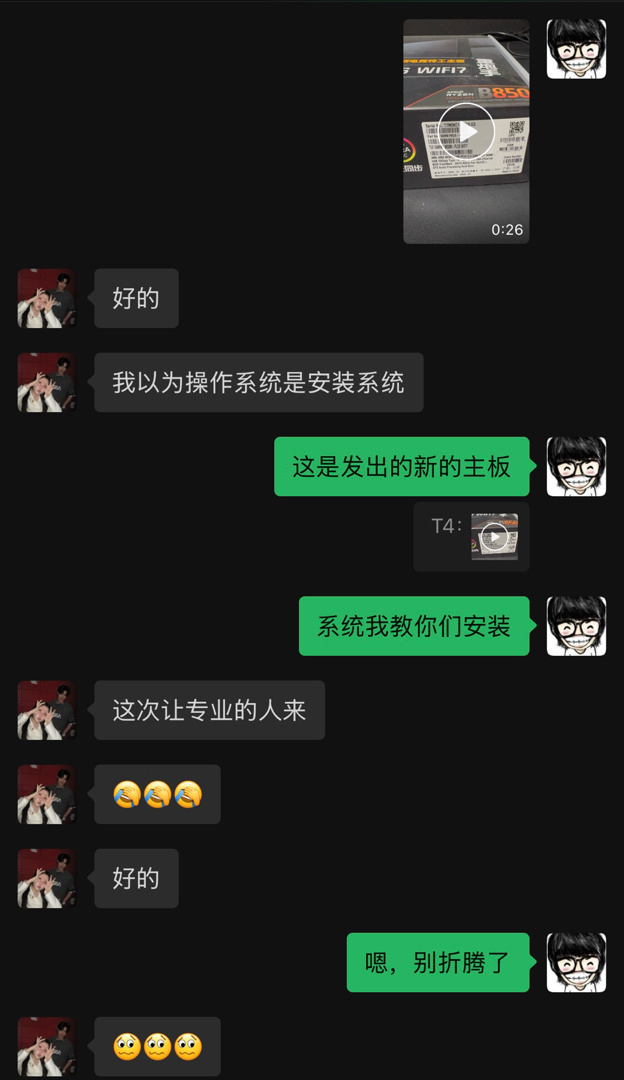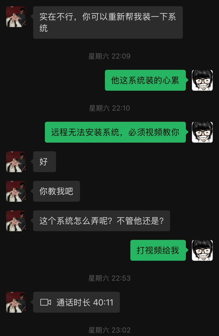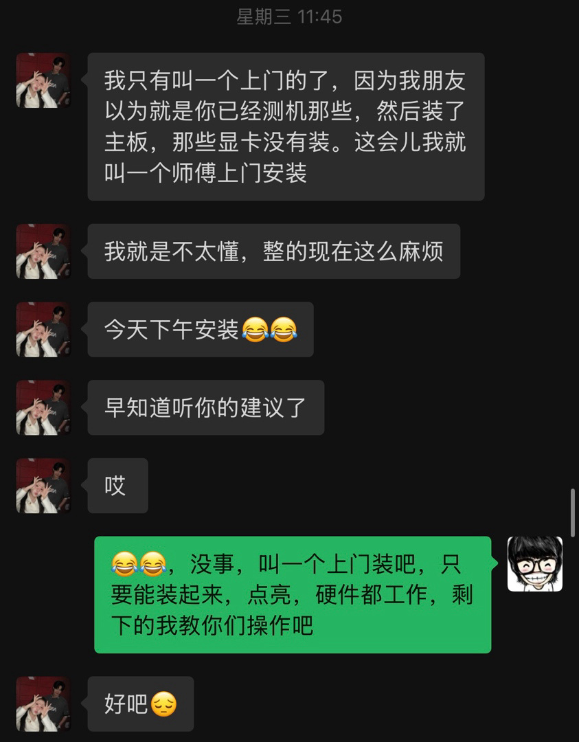 另外,我怕再出現什麼意外情況,就表明,只要裝機師傅上門裝好硬件,調試和系統問題我視頻教她安裝。
