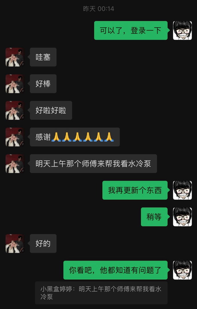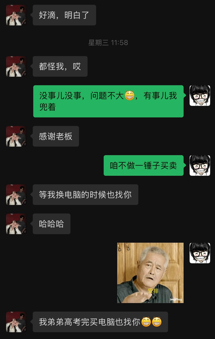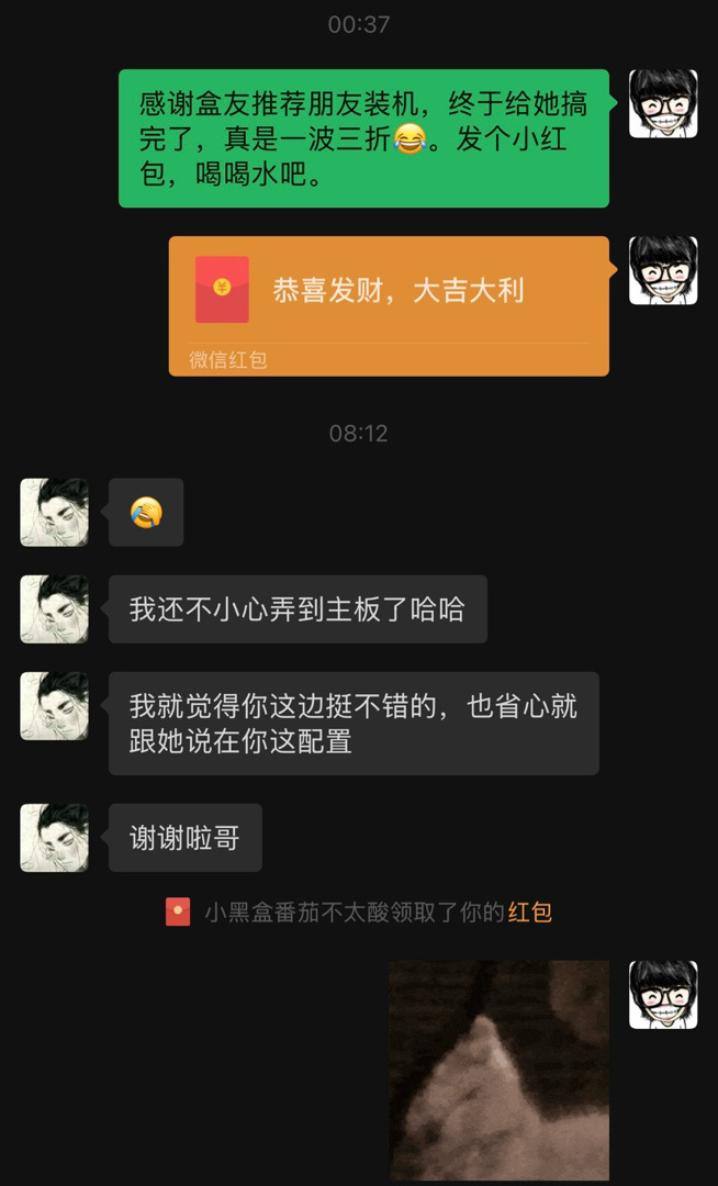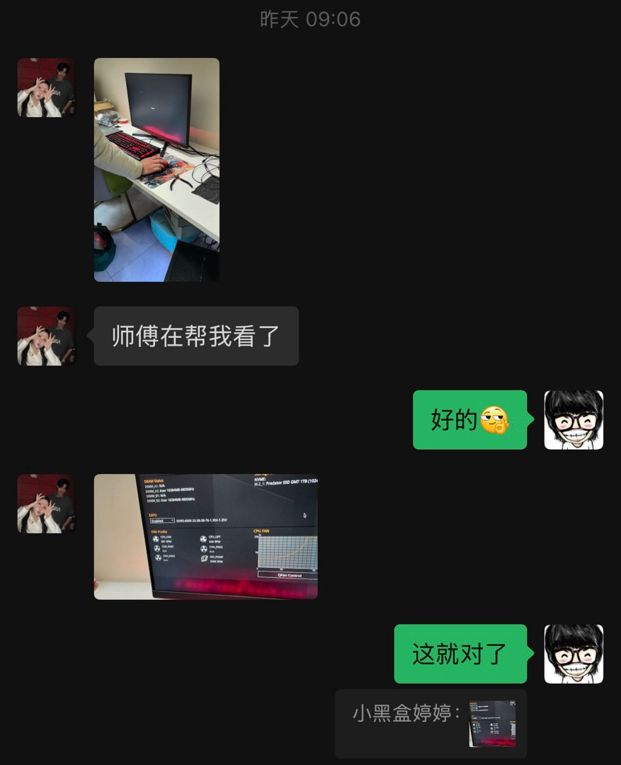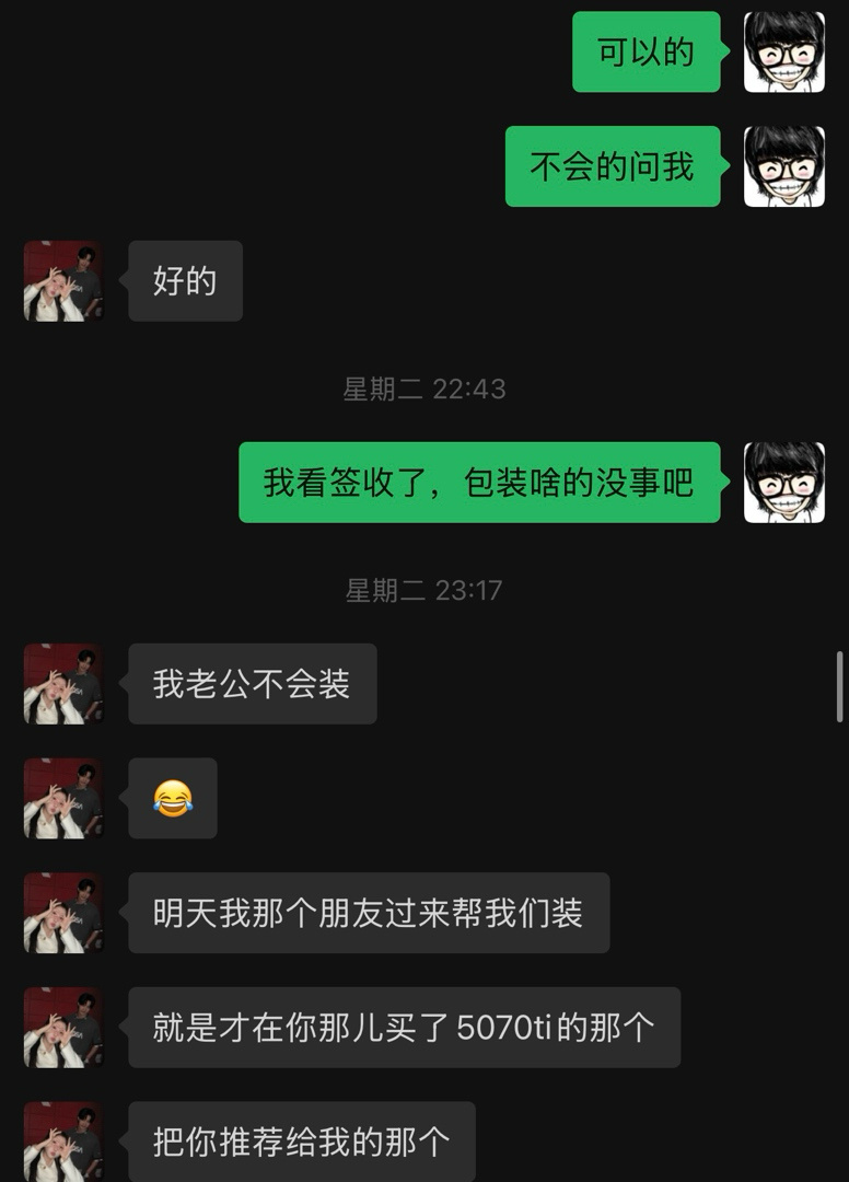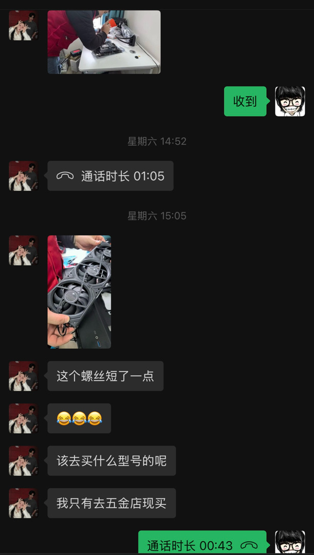 當天她也同意找個裝機師傅上門安裝,也怕師傅中途更換配件之類的擔心,我就安撫了一頓。