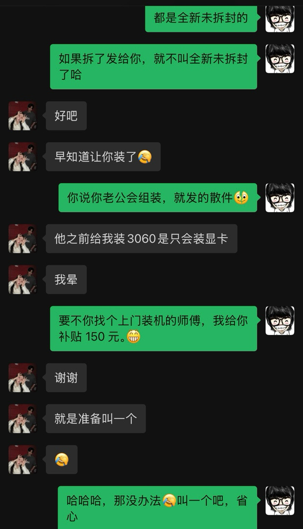 我怕出事故,就建議她找個專業的裝機師傅上門去組裝,也提出了上門費我補貼她150元的方案。