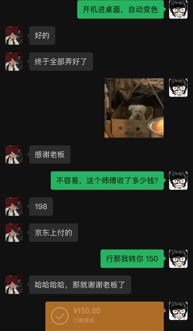 系統裝好了,驅動打完了,系統也優化好了,也把神光同步了,之前承諾的補貼150元,也轉給她了。