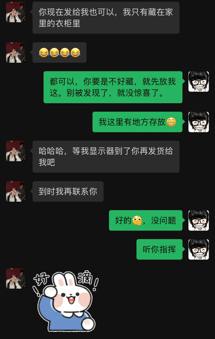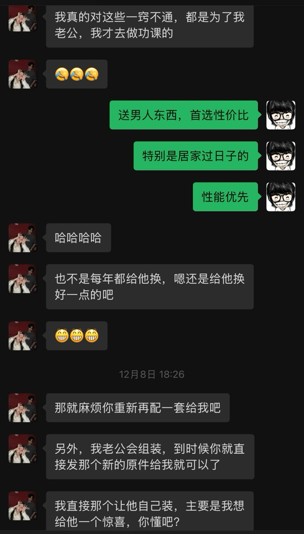 這時候,她說她老公會組裝電腦,讓我郵寄未拆封原包裝,生日那天準備擺起來給他一個驚喜,那就是跟我想的一樣。