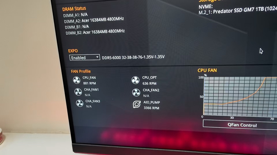 既然我指導重裝系統,必須要去給他BIOS一起調試一下的。在視頻裏面瞄了一下風扇轉速。