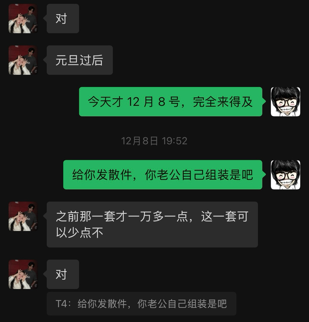 一開始她想找之前推薦我給他的盒友,過去給他組裝,這個地方開始覺得有點擔心了,萬一搗鼓半天搞壞了咋整。