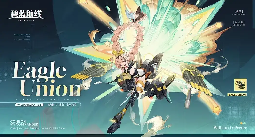 相比之下,另一位UR驱逐舰「威廉·D·波特」则将“活力”二字写在了脸上,如小魔女坐在扫帚上飞行一般活力满满的前冲姿态,搭配上爆发风格的背景图,再加上洋溢青春气息的水手服上衣与侧身那一片抓人眼球的白色......事实上,对指挥官们来说,威廉·D·波特也不是什么陌生面孔——开服至今,游戏加载条上那个跑条的角色剪影就是她。
