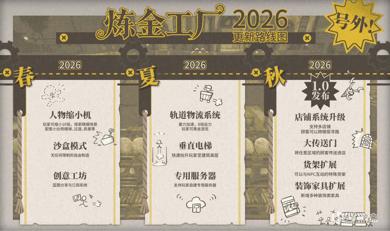 今天,我们将发布《炼金工厂》抢先体验阶段的更新路线图,详细说明我们计划在2026年推出的一些重要更新内容及时间节点。我们将按照这些节点推进内容更新,直至1.0版本发布,同时,持续优化和改进游戏的平衡性、易用性和性能表现,并增加更多语言支持。