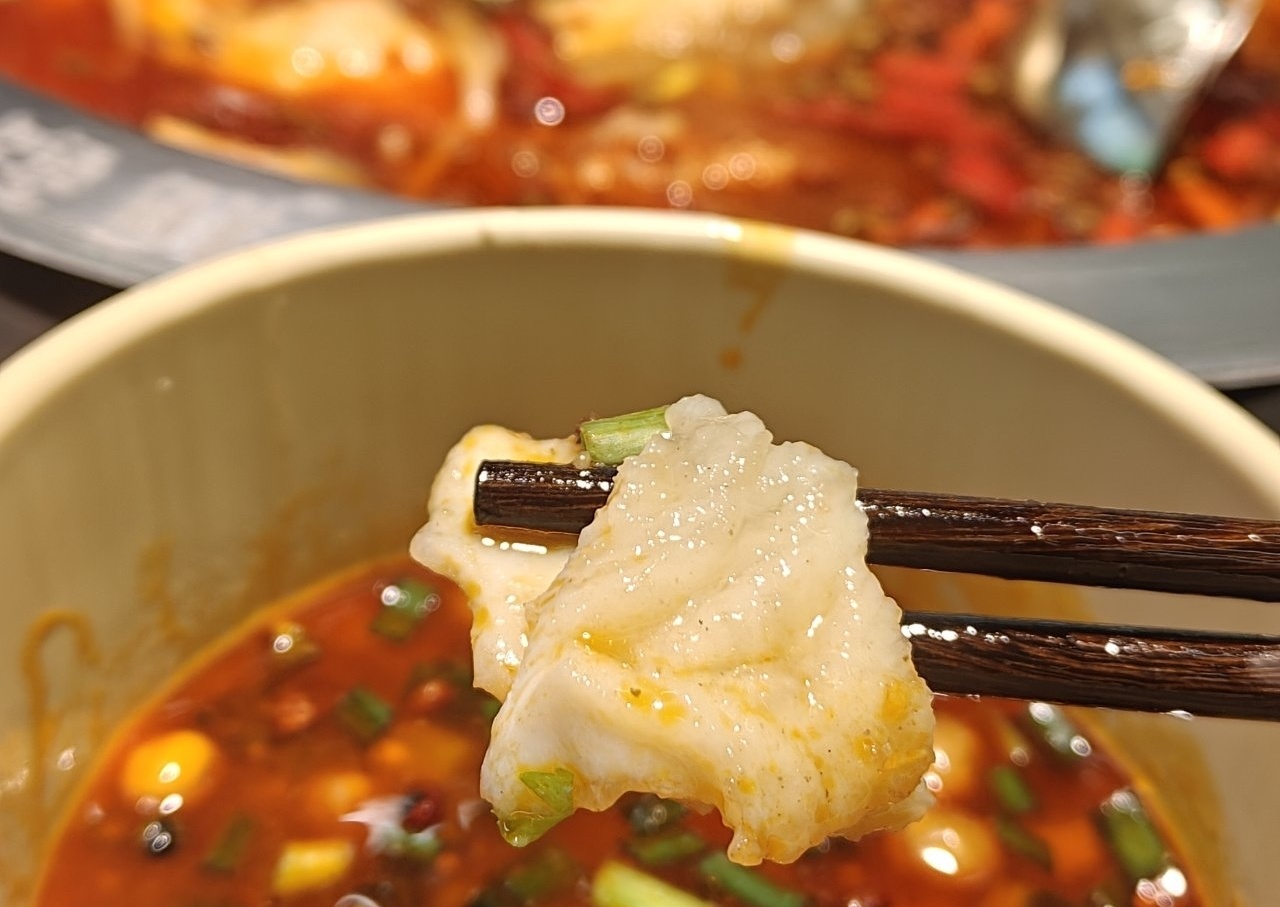 店裏寫的魚都是用的7斤以上的胖頭魚,也就是鱅魚,我家那邊叫花鰱,魚本身很大,切得也很大塊,醃製時掛了一層薄薄的糊,喫着挺嫩的。魚肉新鮮,喫着沒魚腥味,只是有的部位肉質比較綿軟,沒什麼彈性,不知道是不是魚太大的原因。