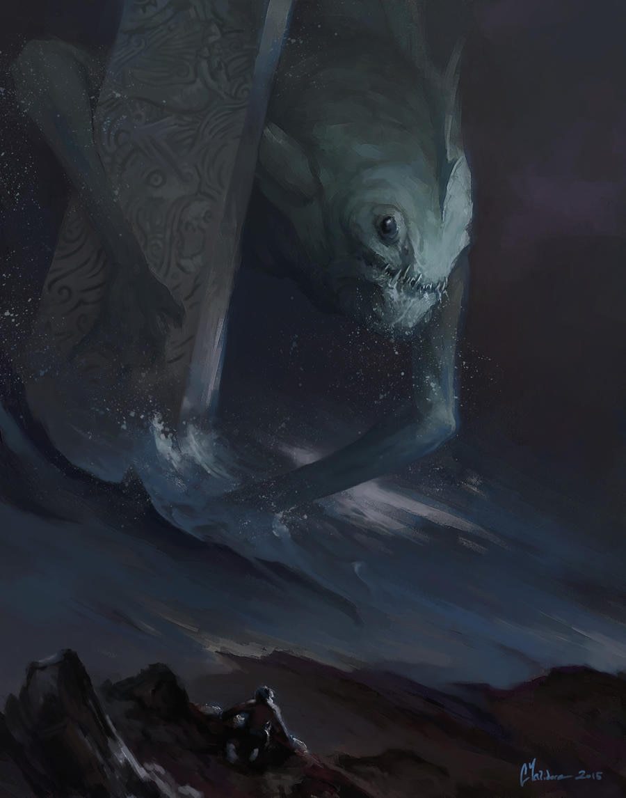 在后世作者的演绎中,达贡的形象更为具体:巨大的鱼头狰狞可怖,面部布满黏液与触须,躯干虽呈人形却极度扭曲,双手为锋利的鳍状爪,行走时伴随湿滑的鳞片摩擦声。