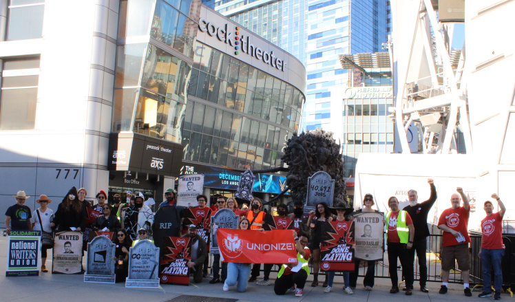 比起TGA的現場喧囂,當時“孔雀劇院外”的活動更加熱鬧。僅一牆之隔,“電子遊戲工會”組織着被裁員工的抗議,他們拿着紙質“墓碑”,上面是工作室的生卒年月;他們舉起前任老闆的肖像,上面畫的是“懸賞通緝令”。