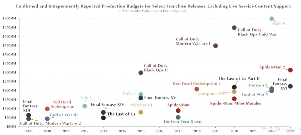 數據顯示,3A遊戲的開發成本年年上漲,哪怕不算營銷支出,部分產品的成本也已接近6億美元。這種“豪華賭桌”的模式無疑伴隨着巨大的風險,而當3A大廠的股東開始施壓,那“裁員”就是會被選擇的事情。