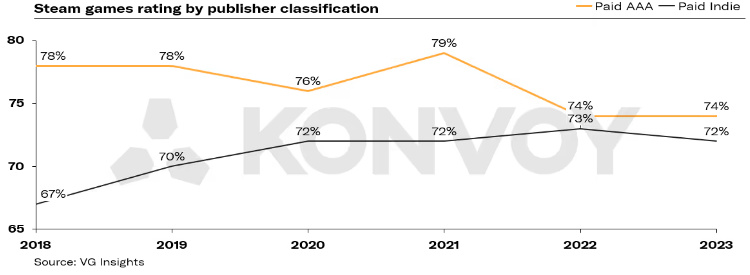 那麼,也就可以理解爲什麼包括TGA和其他媒體,都在有意忽視3A,而主推“獨立遊戲”。一方面,獨立遊戲確實爭氣——早在2023年,Steam的平均好評率就已能和3A遊戲的平均好評率,分庭抗禮;另一方面,獨立遊戲也是一種解決方案,解決了開發成本問題,解決了遊戲太貴的問題,也解決了創新問題和投資風險問題。