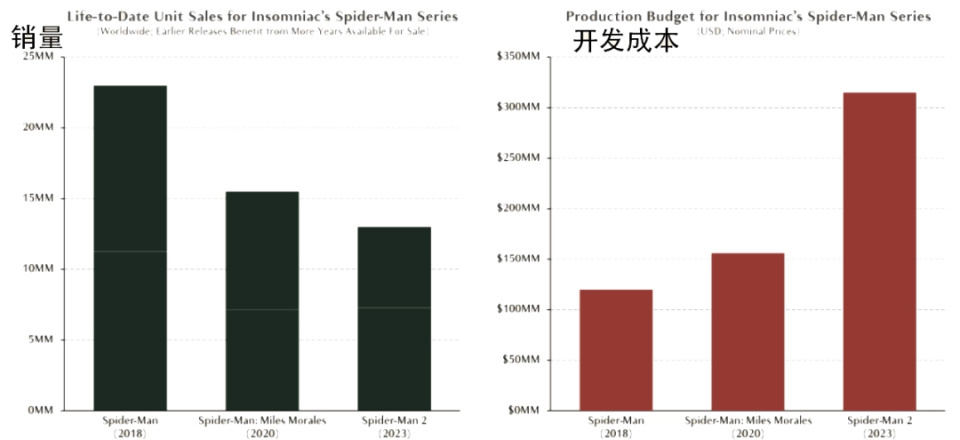 但冤枉嗎?也真不冤。像《龍騰世紀:影障守護者》《哥譚騎士》這些虧麻了的3A項目就不多點名了。且拿商業和口碑都很成功的“漫威蜘蛛俠”系列舉例,它三代遊戲的開發成本翻了兩倍還要多,銷量卻是每代都在下滑,這種表現就很有代表性。