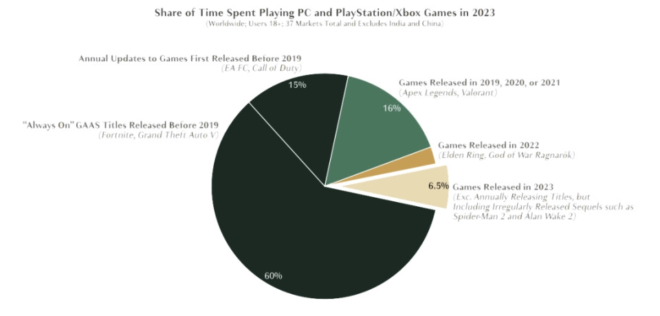 數據能佐證上述假設,2023的主機平臺和Steam平臺所有玩家的總遊戲時間,60%花費在四年前的在線服務遊戲,16%被花費在3年內的在線服務遊戲,15%花費在年貨遊戲,只有6.5%的時間,被用來玩2023年的新遊戲。