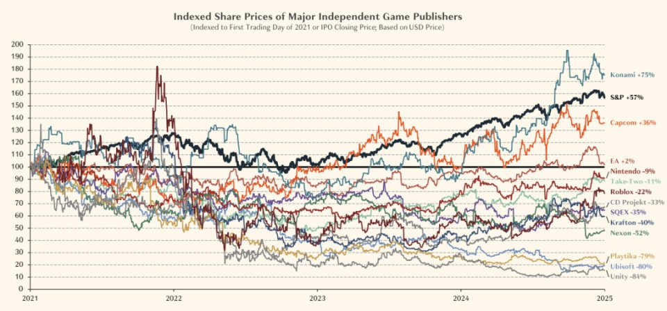 統計至2025年初,行業整體拿到的“創業投資”連續四年下滑。大廠的股市表現證明了這點,相比2021年他們的股價是跌多漲少,跑過“標普500”的僅有Konami這一家。換句話說,就是投資遊戲不賺錢,投資者正在失去信心。